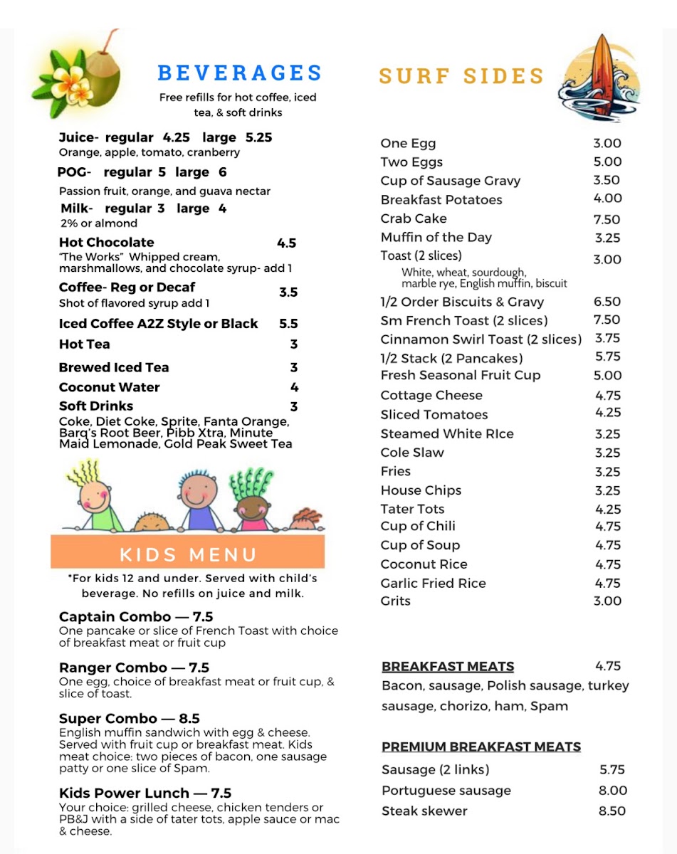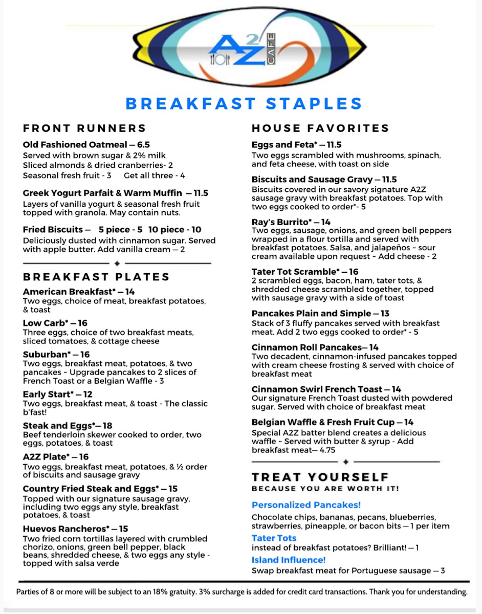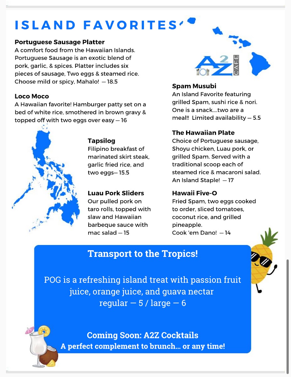 Welcome to A2Z Cafe, a delightful spot for breakfast and lunch located at 3855 E 96th St in Indianapolis. With options for inside and patio dining, as well as convenient carry-out and curbside service, this locally owned gem caters to all dining preferences. The menu boasts a rich variety of dishes, blending American comfort with Hawaiian and Portuguese influences. Highlights include the country-fried steak for breakfast and the unique Tapsilog, a Pacific twist on steak and eggs, accompanied by perfectly seasoned garlic rice. Customers rave about the vibrant flavors, generous portions, and the feeling of home that permeates the cafe. The friendly staff, combined with a clean and inviting atmosphere, makes each visit a pleasure. Whether you’re grabbing a quick bite or enjoying a meal with loved ones, A2Z Cafe promises a memorable dining experience every time. Don’t miss out on their famous French Onion soup!